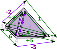 | Here we choose the labeling of the points, lines, triangles and so on to show the combinatorics aspects. Instead of giving each dimenstion its own labeling scheme we choose a labeling scheme that illustrates the relationship between the dimensions. | ![]() |