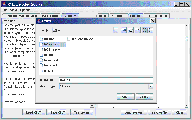 Now that the header file has been generated we can now generate the .cpp file. To do this we press the 'Load XSLT' button and select the 'toCPP.xsl' script.