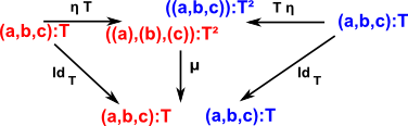 Given a monad: T: C -> C , 1 =>η T <=µ T denoted by the triple <T,η,µ>