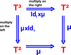 | The associative square says that we can multiply on the right first (IdT×µ) or on the left first (µ×IdT) and the result is the same. | The unit triangles say that we can insert the unit on the right first (IdT×η) or on the left first (η×IdT) and in each case when we multiply we get back to where we started.. | |