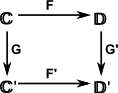 Secondly our diagrams often don't have loops. Any loop in the diagram could be fully interconnected by arrows but where there is no loop, as in the square above, there are arrows that are not implied. For example, between C' and D. When we are interested in diagrams commuting then we don't need loops.