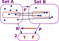 | We have two sets, 'A' and 'B', with an arbitrary mapping 'F' between them. We can define a subset of set 'B' by using the predicate 'P'. For every subset of 'B' defined by 'P' there exists a subset of 'A' defined by 'R'. | ![]() |