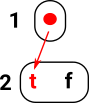 | The characteristic arrow: xf classifies objects of B to determine if they are images of A. This is a pullback square. The object 2 has two values: 0 and 1. We also use the symbol Ω and call the elements 'true' and 'false'. | ![]() |