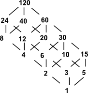 As an example of a lattice we will look at factorising an integer, in this case 120. The following table the columns represents an integer we are trying to factorise and the row represents the the integer we are trying to factorise by. The entry in the table is a boolean value where '' represents true and blank represents false depending on whether row is a factor of column: