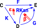 We are given 3 categories 'C', 'D' and 'E' and 2 functors F:C->E and K:C->D. The Kan extension tries to find some unique functors between D and E: |