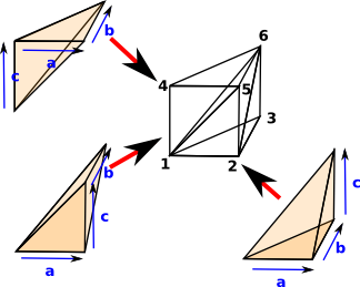 Now, for each of the triangles in the previous case we will multiply by an edge. Then each of those tables produce a wedge shape which can be made up of 3 tetrahedron shapes: These tetrahedrons can be determined by the order of their edges